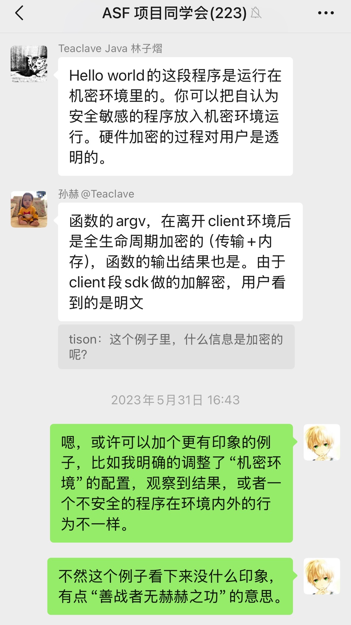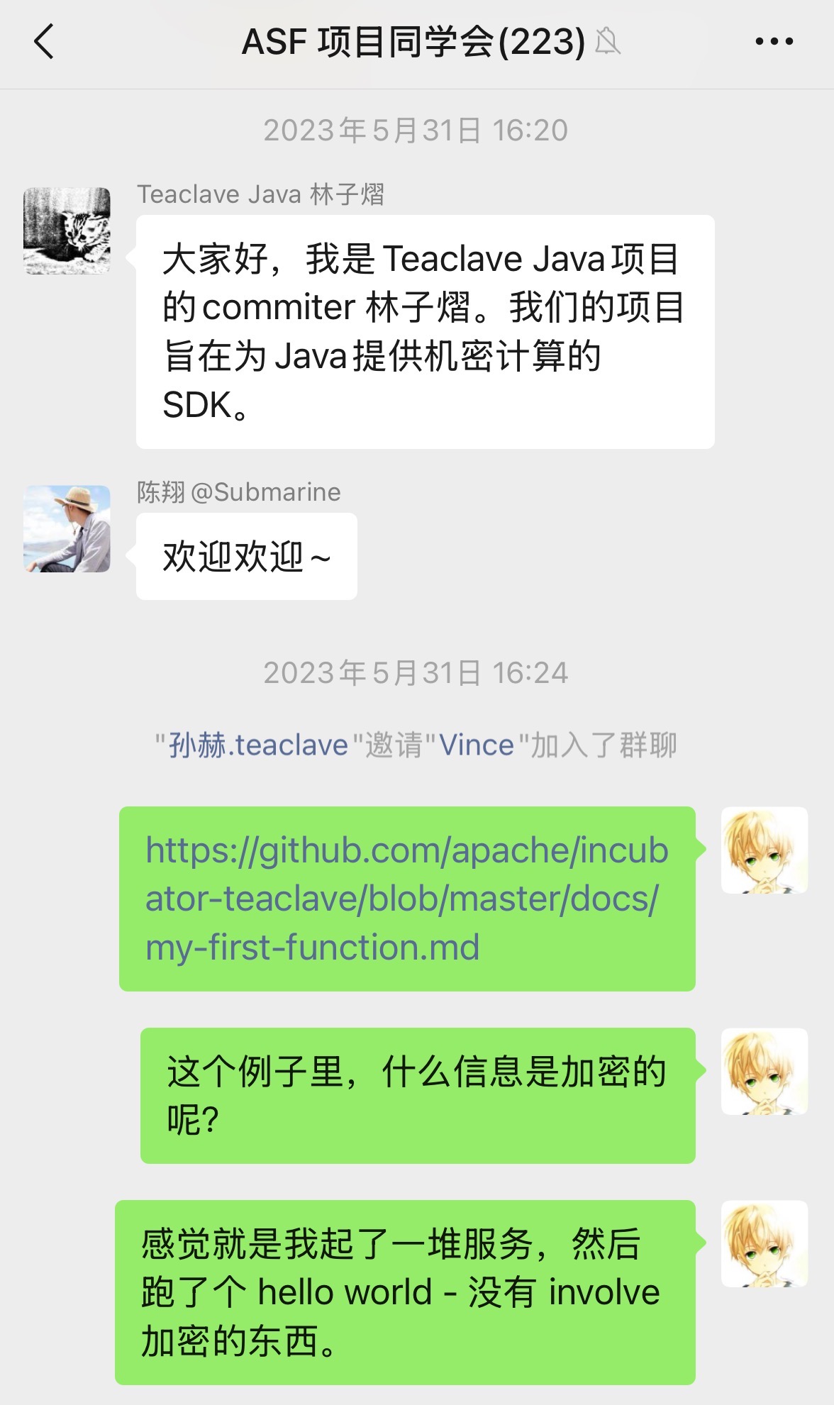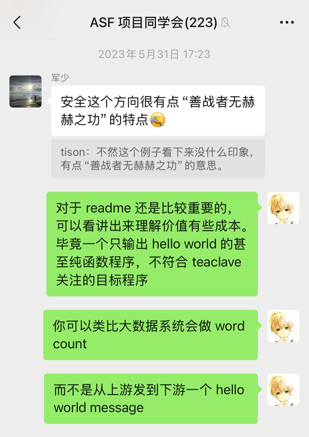 我第一次了解 Teaclave 项目,是在 2023 年中 ASF 项目交流的微信群里偶然看到的。