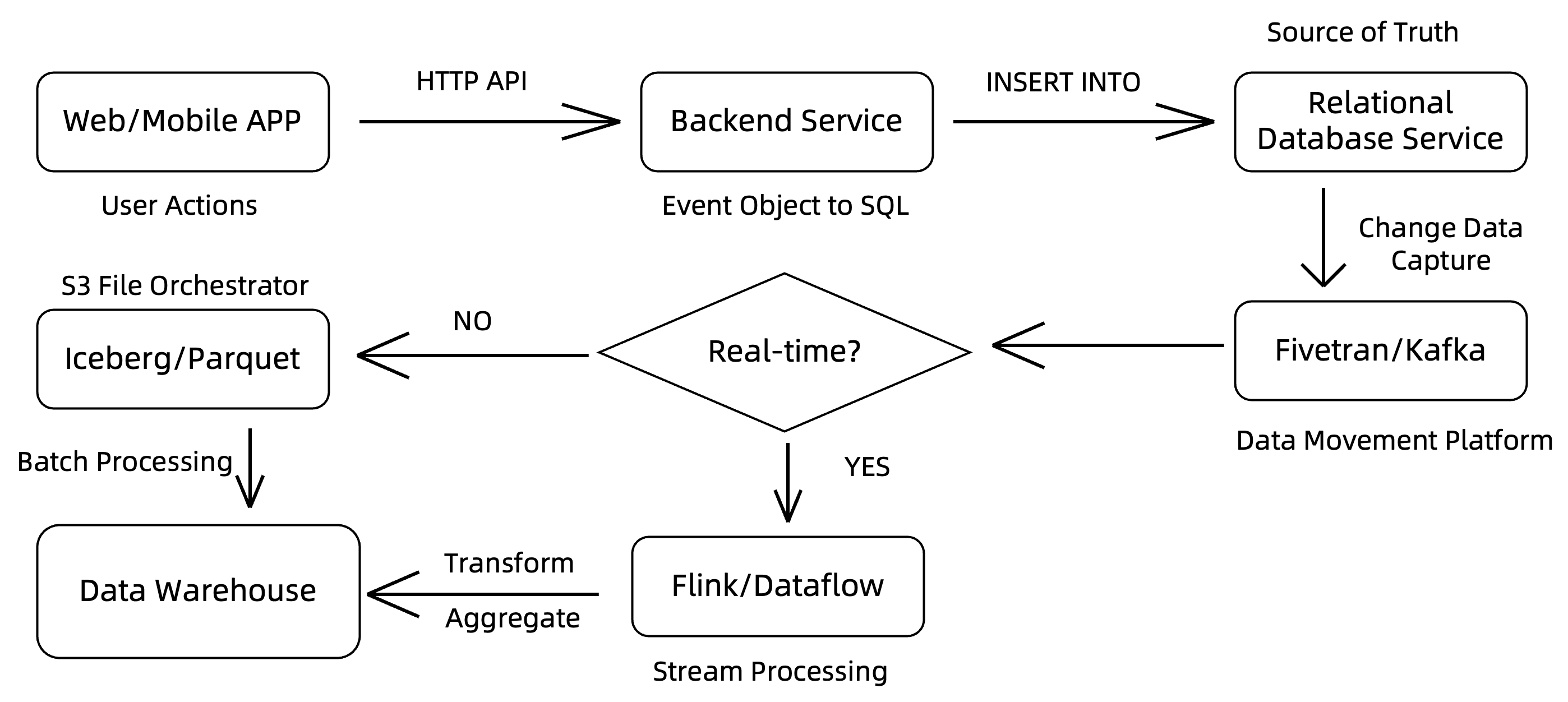 - 例如,对于历史记录明细数据,通常是写成存储系统(S3 或更传统的 HDFS 等)上的文件,再批量加载到数据仓库中;