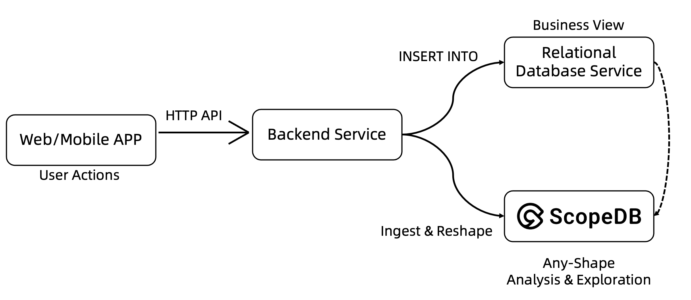 - 后端应用逻辑将事件对象(通常是 JSON 格式)映射到业务关系模型,并写入 OLTP 关系数据库;
